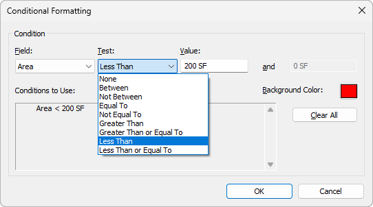 Example uses of conditional formatting include setting a condition to indicate that an area has a square footage under a specified minimum, or whether the correct amount of airflow is being supplied to each of the rooms in the model.