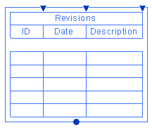 The bottom of the revision schedule displays a blue dot. Grid lines display to indicate the amount of space required for each row of revision information (assuming one line per revision row; in a sheet, long values wrap to the next line). In this mode, these grid lines display regardless of whether the revision schedule is set to display grid lines.