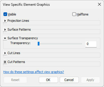 The View-Specific Element Graphics dialog shows the current visibility and graphic display settings for the element. Expand each section to see its settings.