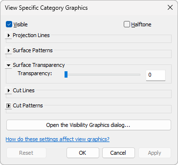 - In the View-Specific Category Graphics dialog, change the settings as desired.