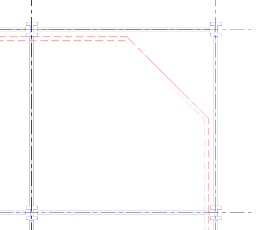 The following images show a view whose phase filter determines that existing elements display as blue solid lines and demolished elements display as red dashed lines.
