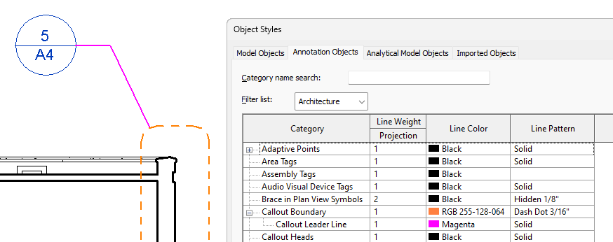 You can control the line weight, color, and the pattern used for callout bubbles and leader lines. The settings that you specify here apply to all callouts in the project.