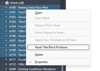 Use Reset Title Block Positions to move placed title block instances on sheets back to the default origin.
