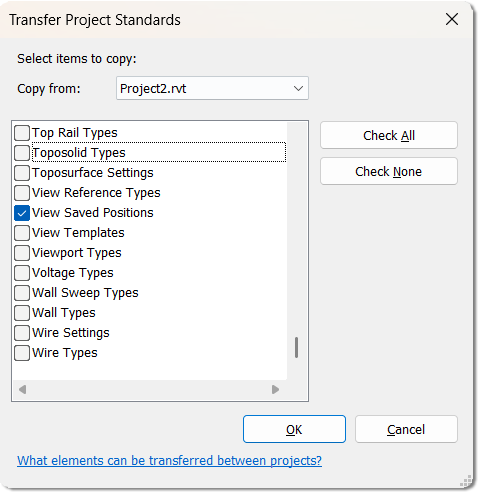 This will transfer all Saved Positions into the specified model. Revit will check for matching Saved Position names, as well as the values defined in each, and prompt to overwrite if applicable.
