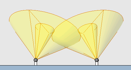 For example, in the following image, the left spotlight has a smaller beam angle and field angle. For the right spotlight, the tilt angle was changed from 60 degrees to 45 degrees.