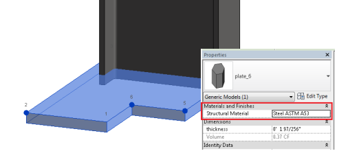 In the following example the base plate material was modified to "Steel ASTM A53" in Advance Steel. This modification was then synchronized in the Revit project. The difference is spotted as a material change. If the modification is applied, the plate material is changed according to the new value.