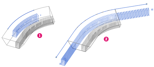 You can adjust the range of the path shape distribution by dragging start or end of the path handles along the distribution path (1) or outside of it, where they extend on a tangent (2).