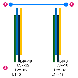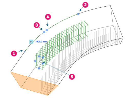 The position of the constraint handles is shown in the following example, where the Start of Path (1) has an offset of -3000 mm from the cover of the highlighted face (constraint target).