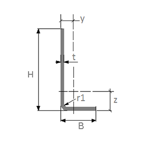 B. Width: the external width of the section shape. H. Height: the external height of the section shape. T. Wall Design Thickness: the perpendicular design thickness between the inner and outer surface of a section shape. t. Wall Nominal Thickness: the average perpendicular distance between the inner and outer surface of the section shape. r1. Inner Fillet: the radius of the inner corner fillet of a bend in a cold-formed steel section shape. y. Centroid Horizontal: the distance from the centroid of the section shape to the left extremities along the horizontal axis. z. Centroid Vertical: the distance from the centroid of the section shape to the lower extremities along the vertical axis. |