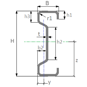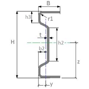 B. Width: the external width of the section shape. H. Height: the external height of the section shape. b2. Bend Width: the distance between the left extremities of the section shape to the exterior surface of the middle bend segment. h1. Lip Length: the distance between the exterior surface of the section shape and the end of the lip segment. h2. Middle Bend Length: the length of the interior surface of the middle bend segment. h3. Top Bend Length: The distance between the exterior surface of the top of the section shape and the end of the top bend segment. T. Wall Design Thickness: the perpendicular design thickness between the inner and outer surface of a section shape. t. Wall Nominal Thickness: the average perpendicular distance between the inner and outer surface of the section shape. r1. Inner Fillet: the radius of the inner corner fillet of a bend in a cold-formed steel section shape. y. Centroid Horizontal: the distance from the centroid of the section shape to the left extremities along the horizontal axis. z. Centroid Vertical: the distance from the centroid of the section shape to the lower extremities along the vertical axis. |