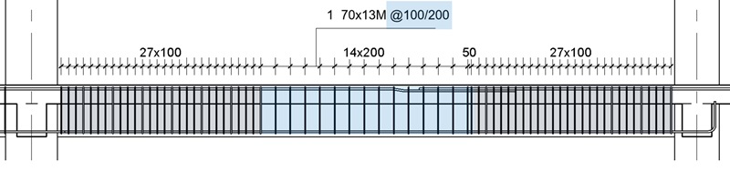 - You specify the maximum distance between rebar, but the number of rebar changes, based on the distance between the first and last bars. Example for Spacing = 200 mm.
