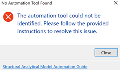 If the quick access automation does not find the automation Dynamo script (based on its GUID) in the specified location, a warning will be displayed, saying that the automation tool could not be identified.