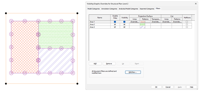 Use filters to identify each area load boundaries in a plan view, based on the loads parameters.