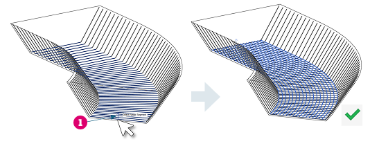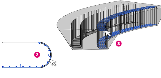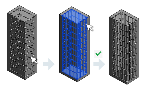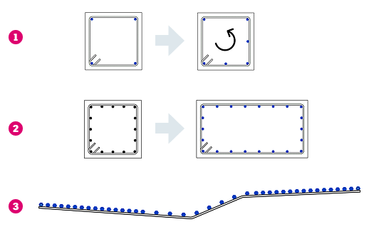 Place longitudinal free form rebar by specifying the transverse rebar it should follow. The transverse rebar can be shape-driven or free form, with the same number of segments for all the bars in the set.