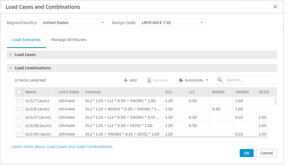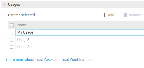 - Optionally, click the Load Usages column and choose one or more usages for your load combination.
