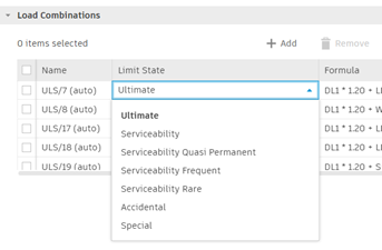 In the Limit State column of the Load Combination table, select the limit state for each load combination: Ultimate, Serviceability, Serviceability Quasi Permanent, Serviceability Frequent, Serviceability Rare, Accidental and Special.