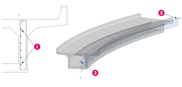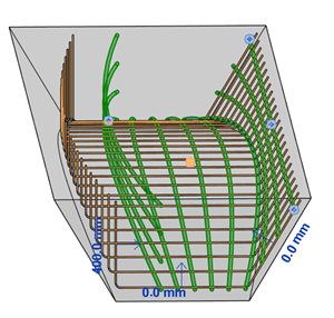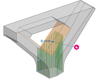 The morphed rebar distribution is automatically constrained to all concrete host faces toward which the bars are oriented. In the example below, the bar ends constrained automatically to the two faces highlighted in orange, at 0 mm cover (4).