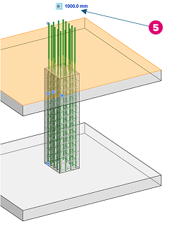 When modeling the longitudinal rebar in columns, you can select the start or end of bar handle and click the top of the slab to set it as the target. You can then input an offset (e.g., 1000 mm) (5) from that face to extend the bars outward.