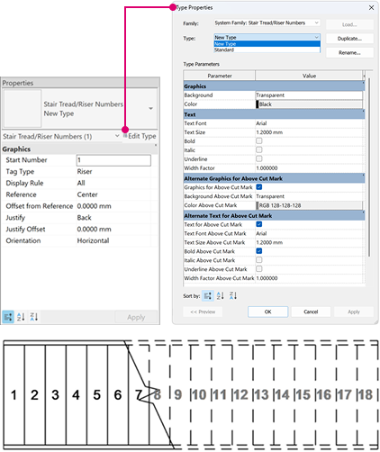 Stair tread/riser numbering elements now include type properties, allowing control over: