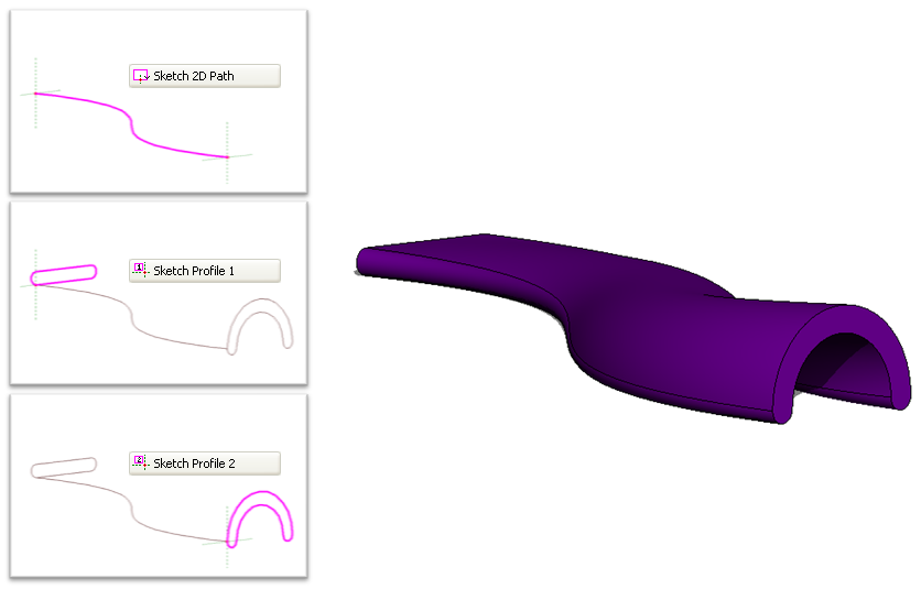 The Swept Blend tool allows you to create a blend that has 2 different profiles and then sweep it along a path. The shape of a swept blend is determined by the 2D path you either sketch or pick and the 2 profiles you either sketch or load.