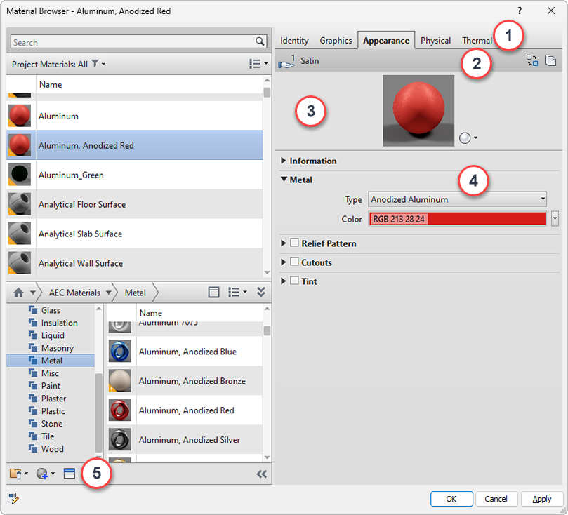 4 Properties panel: Display and manage detailed properties of the selected asset. The asset name and description are displayed beneath the Information drop-down panel. This example above shows the Metal properties being displayed (expanded) for the "Anodized - Red" Appearance asset. The set of properties that are displayed for a liquid, for example, differ from the set of properties displayed for metal.