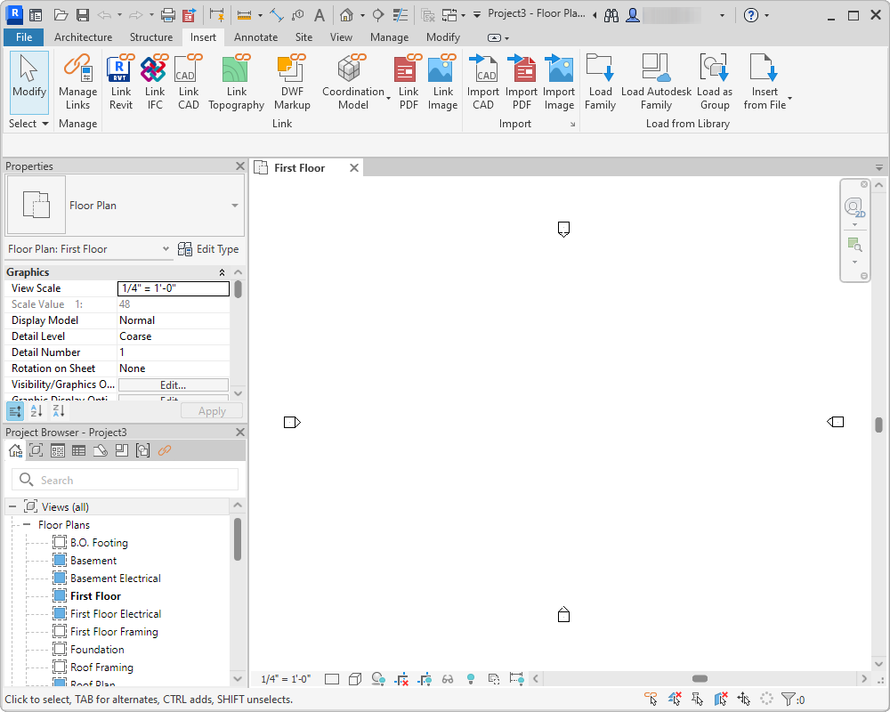The drawing area (canvas) displays views (and sheets and schedules) of the current model. Each time you open a view in a model, the view displays in the drawing area.