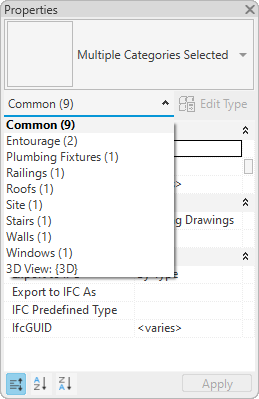 Immediately below the Type Selector is a filter that identifies the category of the elements a tool will place, or the category and number of elements selected in the drawing area. If multiple categories or types are selected, only the instance properties common to all display on the palette. When multiple categories are selected, use the filter’s drop-down to view only the properties for a specific category or for the view itself. Selecting a specific category does not affect the overall selection set.