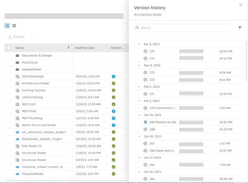 - Grid and list views available. The Grid view Projects shows thumbnails of the cloud models, icon of each model type (workshared or non workshared), publish status with icons.