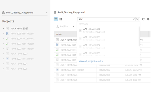 - Search for projects and files, filter by date modified (all, today, last week, last month, last 3 months) and type (families and models).