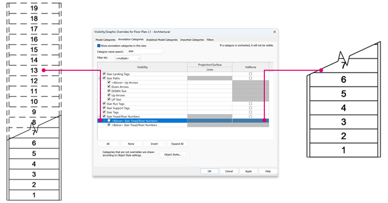 The appearance of stair tread/riser numbers can be controlled independently for elements above and below the stair cut line.