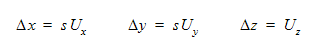 The displacement (denoted as s) is measured relative to the objects starting position. The user can define s as a function of time to move the object along the trajectory path. The trajectory is defined using a directional unit vector (Ux, Uy, Uz). The motion as defined in the global coordinate system is: