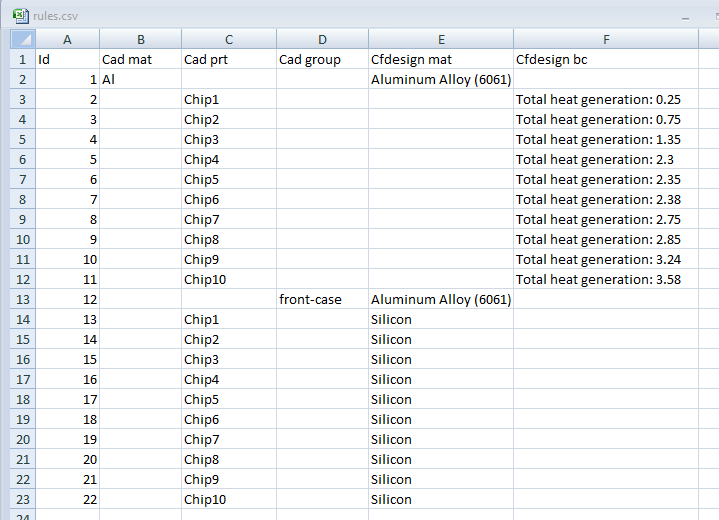 In this example, the table simplifies assigning the heat load and material to the chips. The rules are similar enough that simply copying and pasting the rows nearly completes the definition. To finish, simply modify the heat generation for each chip in the table.