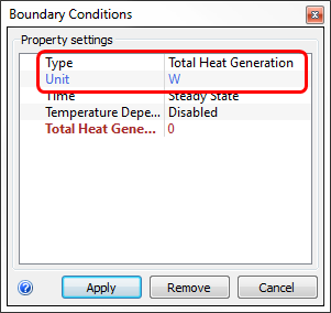 3. Verify the Type is Total Heat Generation, and the Unit is set to W (Watts).