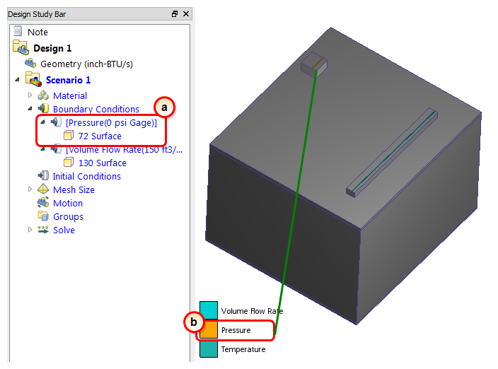 6. To verify that the pressure boundary condition is properly assigned to the outlet, check the Design Study Bar and the colored stripe on the outlet surface: