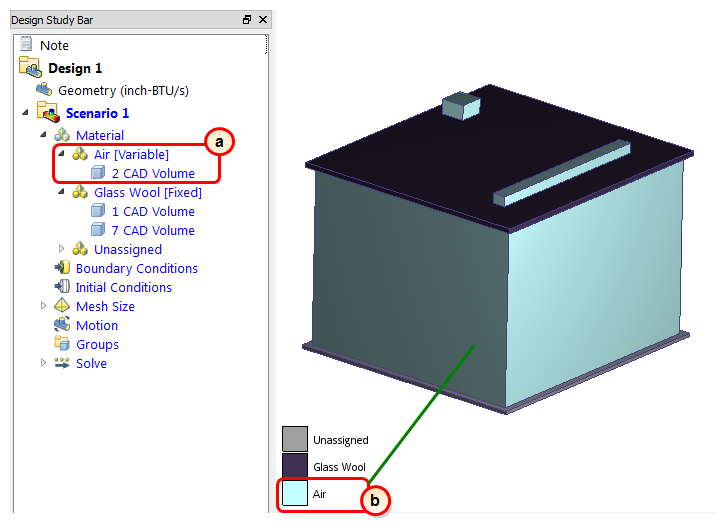 To verify that the air material is properly assigned, check the Design Study Bar and the part coloring: