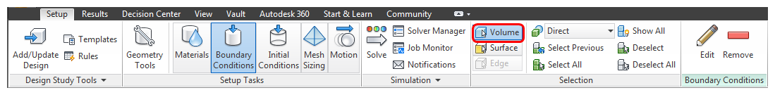 1. To change the selection mode, click Setup (tab) > Selection (panel) > Volume.