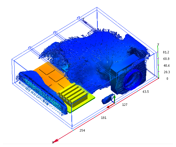 In this tutorial, we model an electronics chassis to determine the component temperatures and the flow distribution. The enclosure consists of two PCBs, several chips, and a few other heat dissipating components. A commercially-available fan moves cooling air through the enclosure.
