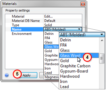 In this step, we'll assign the insulation material to the walls and roof. We'll use the material called Glass Wool as an approximation for an insulated wall. A custom material can be created to simulate a stud wall, if desired.