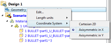 This analysis is axisymmetric about the X axis. We will change the coordinate system in the Design Study Tree.