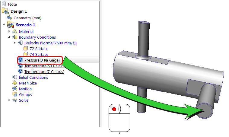 Left click on the Pressure condition, and drag onto the outlet surface: