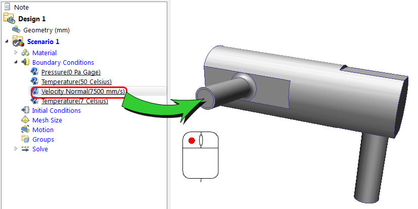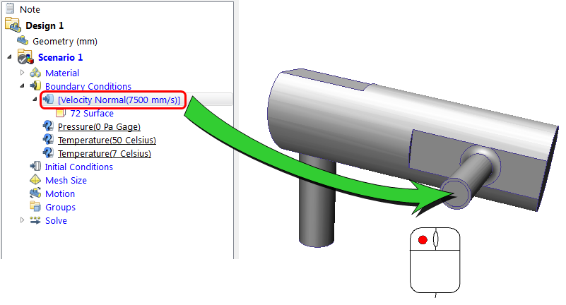 Left click on the Velocity condition, and drag onto one of the inlets: