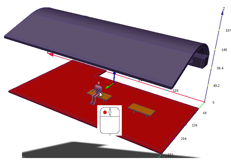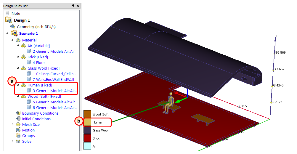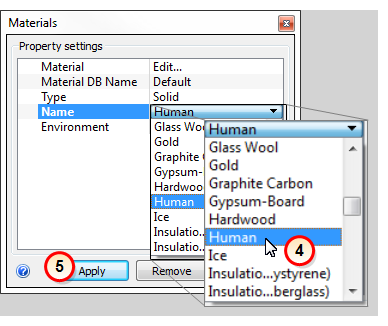 In this step, we'll assign a material that simulates the thermo-physical properties of a human body to our occupant. The default installed material database does not contain an actual "human body" material, so we'll use silicon as a close analog. A more rigorous approach would be to create a material with the actual properties of a human body, and add it to a custom material database.