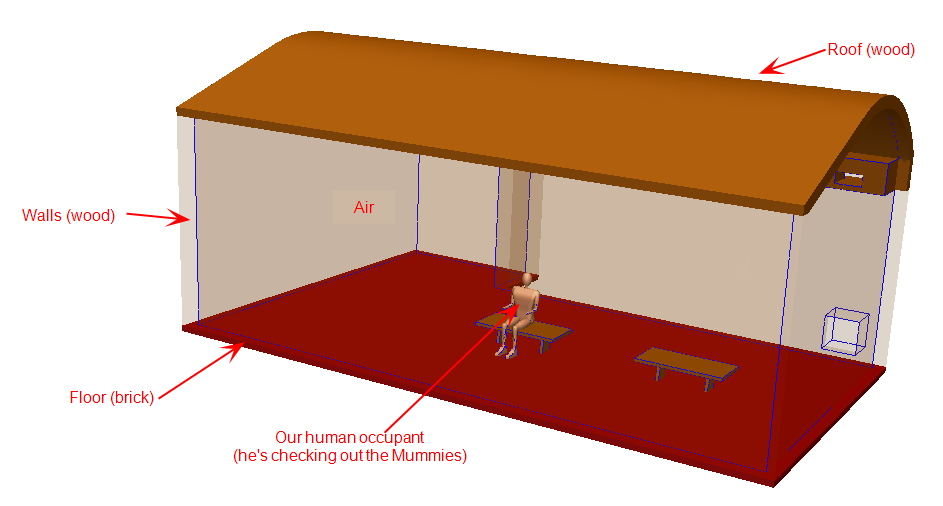 The exhibit hall is an open atrium with insulated walls and roof, a brick floor, two benches, and a human occupant resting on the bench (it's been a long day, and he's checking out the Mummy exhibit while the wife and kids visit the gift shop).