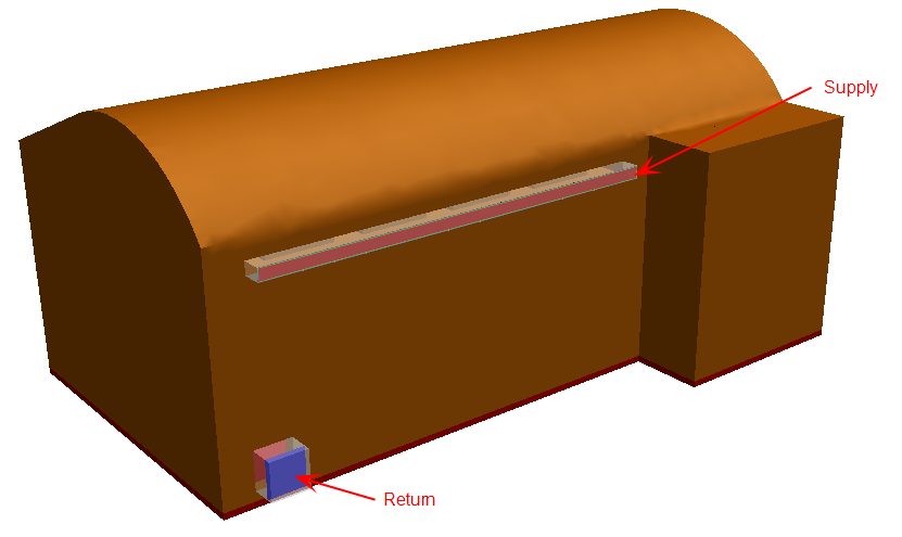 For the Summer scenario, the ventilation system supplies 64 °F cooling air to the hall; for Winter, the system supplies 85 °F heating air.