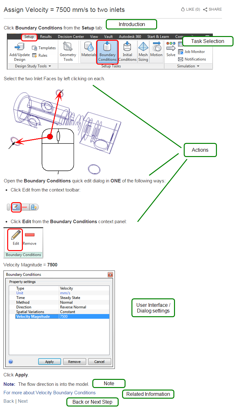 A convenient way of working the examples is to position the browser and Autodesk® CFD beside one another. Most steps use a narrow layout that shows well with a reduced browser width.