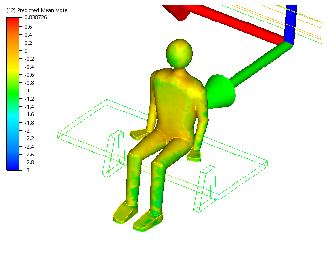 In this step, we will use the Predicted Mean Vote (PMV) to assess the impact of the design of the hall and ventilation strategy on the thermal comfort of the occupant. Autodesk® CFD calculates PMV using several factors (such as local air flow velocity, temperature, clothing, metabolic rate, humidity, and radiant heat exchange) to determine how warm or cold a person feels inside the space.