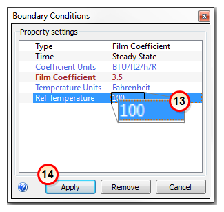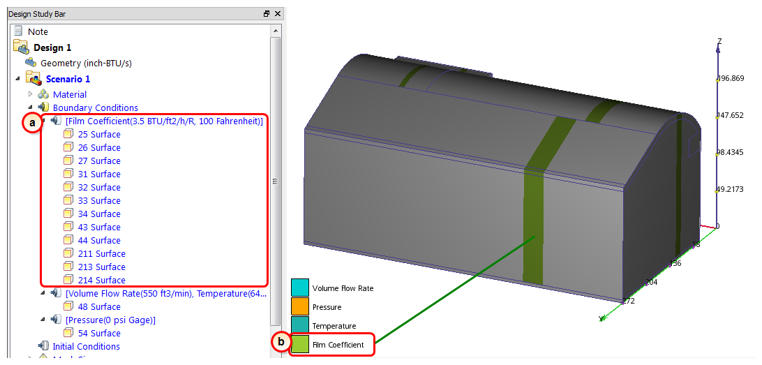 15. To verify that the film coefficient boundary condition is correctly applied to the exterior surfaces, check the Design Study Bar and the colored stripe on the surfaces: