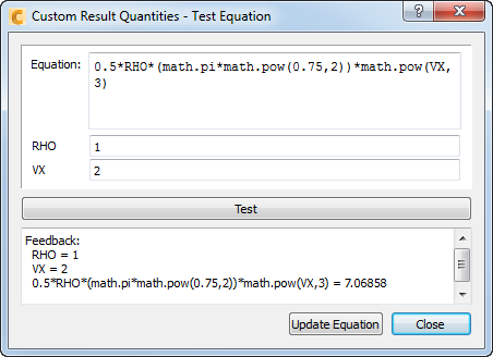 Click Test Equation to open a dialog in which you can verify and modify your equation. If you do modify your equation, click Update Equation to pass the new equation back to the Custom Result Quantities dialog.