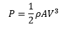 where P is the power (W), ρ is the density of air (kg/m3), A is the area (m2) of the circle created by blade rotation, and V is the wind velocity (m/s).