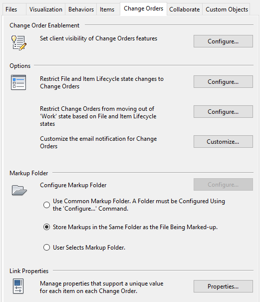 The Change Orders tab contains options for restricting item changes to change orders depending on lifecycle or state, configuring the markup folder, managing change order link properties, and defining change order numbering schemes. You can also disable the Change Orders feature.